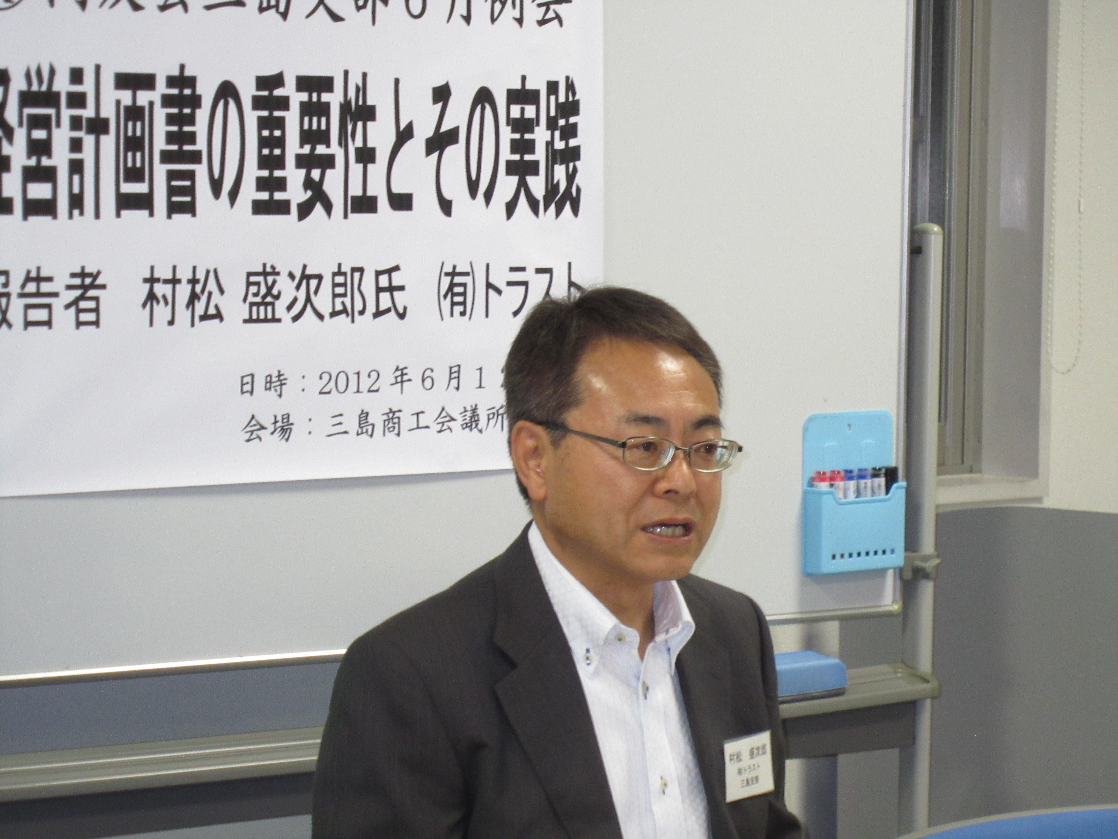 カテゴリー:三島支部 / 新着情報 6月12日の三島例会は、村松盛次郎氏(㈲トラスト)による報告。テーマは「経営計画書の重要性とその実践」と題し、村松氏の企業から、現在に至るまでを語っていただきました。 同友会歴24年の村松氏は、入会当時から共育という言葉が好きで、「社長はどんどん勉強する。それを社員に教える。社員に教えることでさらに学ぶことが出来る。」と共育ちの重要性について報告。 また、「サービス業は人間性である」「成功ではなく成長を考える」等、会場の会員はうなずきながら話を聞いていました。 報告をする村松氏 最終更新:2012年06月13日