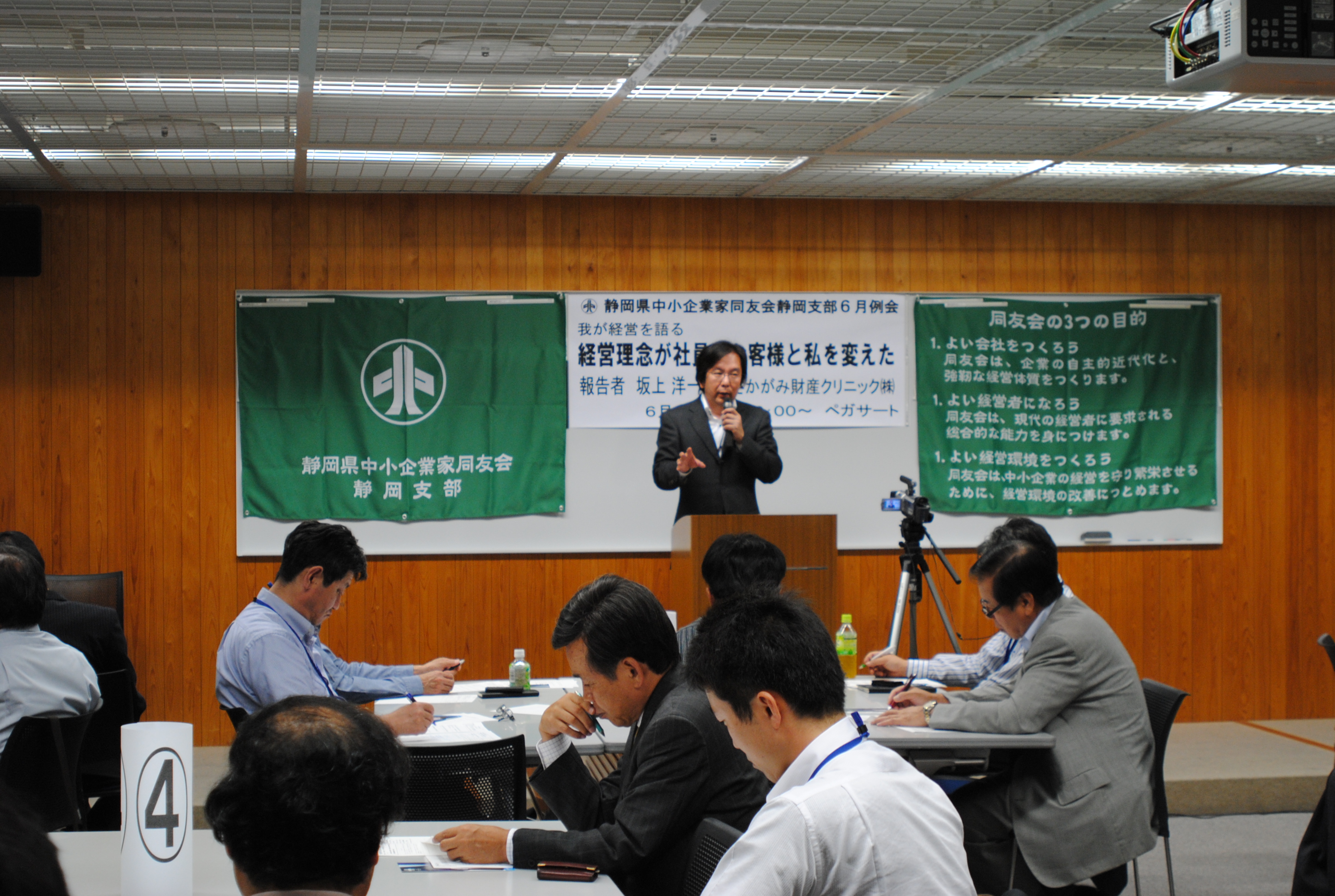 静岡支部6月例会は、さかがみ財産クリニック㈱代表取締役の坂上洋一氏が登壇。「経営理念が社員とお客様と私を変えた」をテーマに報告しました。複数の会社を経営する坂上氏。その一つに十里木別荘管理㈱があります。分譲地として開発分譲され、前管理会社が法人設立、7年後の昨年3月末に会社購入しました。
