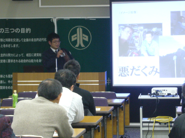 1年半前に入会した、伊藤金物の専務 伊藤光昭氏が「富士市を元気に、オレたち勝手にキックオフ」というテーマで報告しました。自社の販路拡大を考える中で、富士市企画課と繋がり、支部の政策活動として「都市活力再生プラン」に関わっていったこと、継続的に意見交換会が行われ、市への要望書を提出するにいたったことなどを語りました。富士市の工業振興課長ら5名も参加、グループ討論に加わり、相互協力のもと地域を創っていく大切さ、今後の連携に期待を感じるものとなりました。