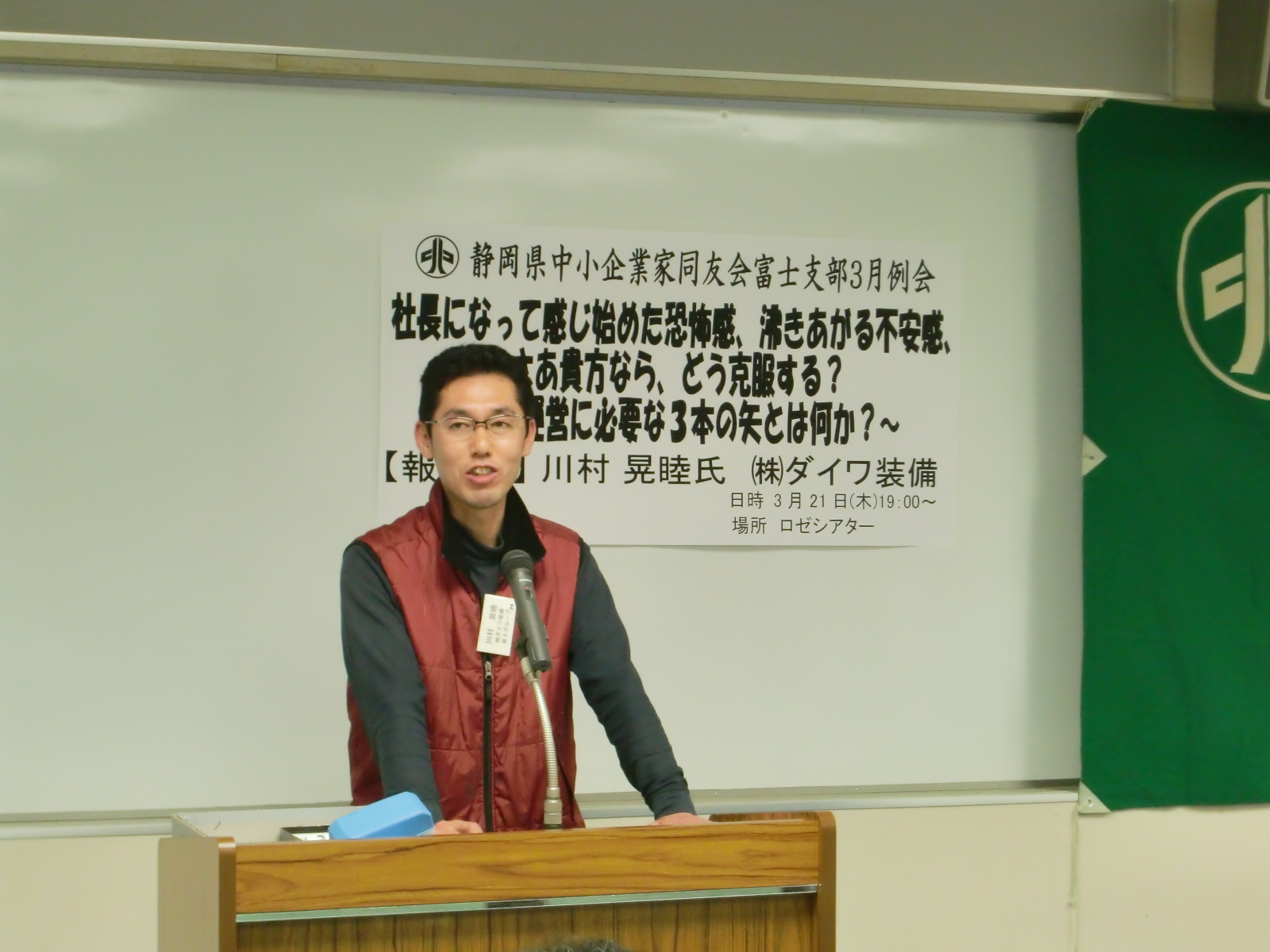 3月例会は、富士支部会員なら誰もが認めるMr同友会こと川村晃睦氏(株式会社ダイワ装備/代表取締役)による報告でした。