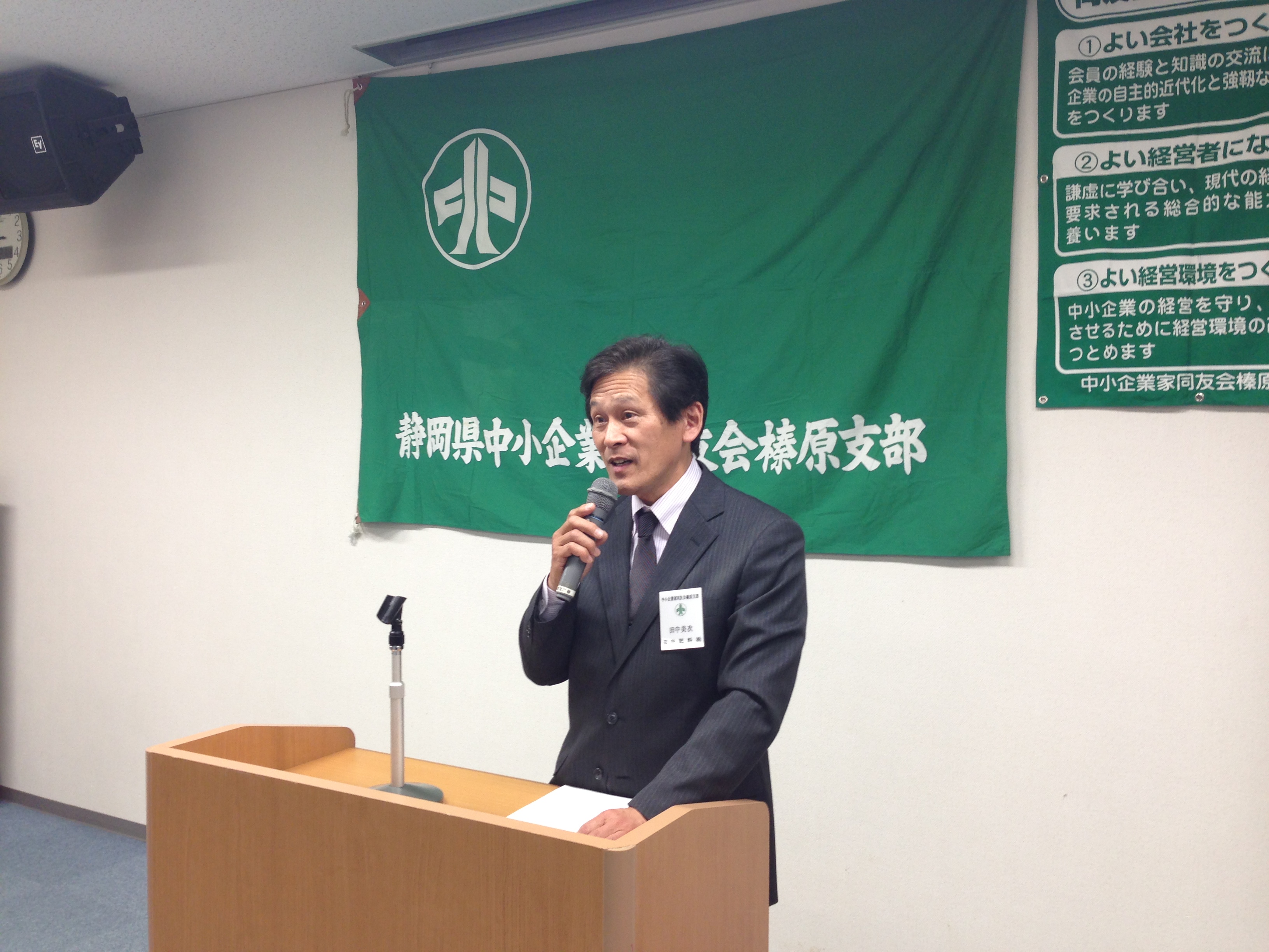 県同友会第8期経営指針を創る会卒業生の田中美次氏(田中肥料㈱代表取締役)を報告者に開催した榛原支部3月例会。吉田町で肥料、農薬、農業資材等の販売メンテナンスを行う同社社長の田中氏は社長就任と同時に同友会に入会、経営指針や社長としての経営姿勢を学び、方針と計画に落とし込み、実践する報告をしました。