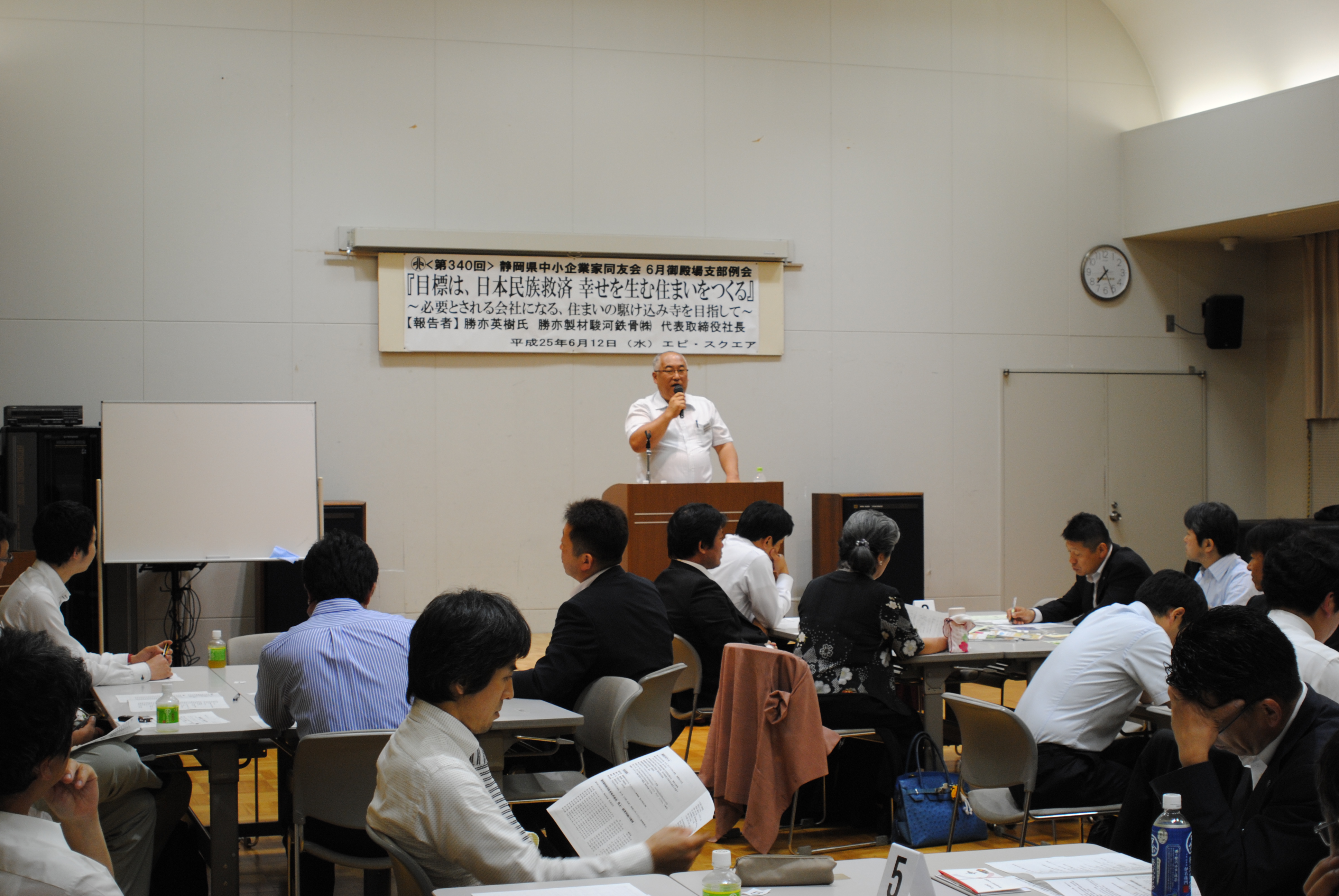 「目標は、日本民族救済 幸せを生む住まいをつくる~必要とされる会社になる、住まいの駆け込み寺を目指して~」をテーマに、勝亦英樹氏(勝亦製材駿河鉄骨㈱代表取締役社長/御殿場支部)が例会報告に登壇しました。6月12日(水)エピ・スクエアにて第340回御殿場支部例会が開催され、44名が参加しました。