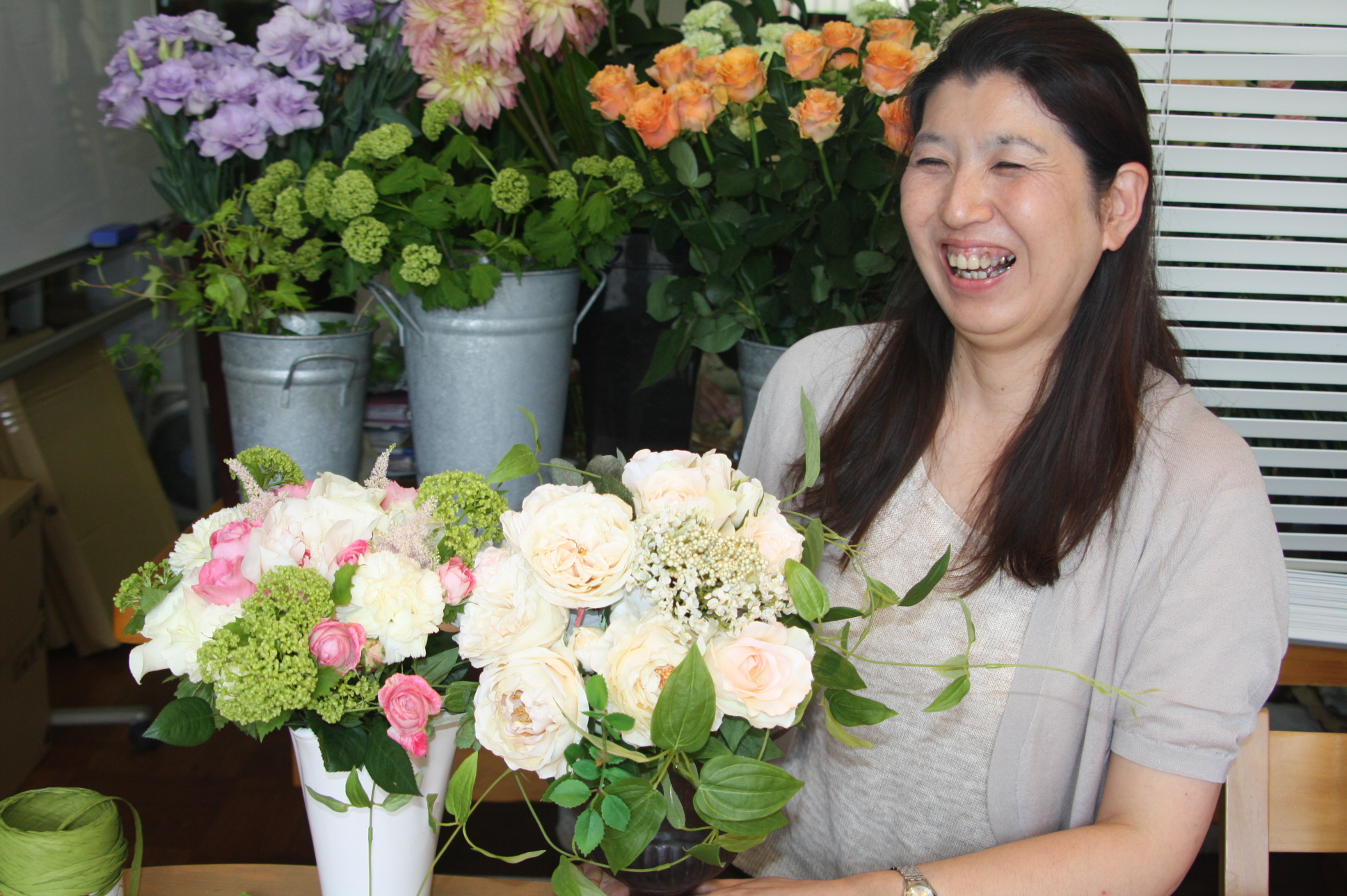 何年か前に買い求めた花器からスタートしたお花の仕事は、お母様の丈の高い生け花への思い出へつながり、生徒さんたちへのアレンジメントの教授をへて、今は、ウエディング会場で、新郎新婦さんの「思い出のドレスアップ」につながっています。