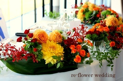 お客様の好みをおききし、それに応じたデザインをする商業デザイナーです。と自称されていました。 印象に残ったのは、県外の方の結婚式で、静岡をお花で表現してほしい、というリクエストでした。(下記写真)色合いはお茶ーグリーン、みかんーオレンジ、イチゴー赤のコーディネート。 メインテーブルは駿河湾に浮かぶ船の形で表現。テーブルクロスは、海を連想させるライトブルーを選ばれました。 また波をグリーンで表現したいと、ゲストテーブルのアレンジはグリーンで囲みました。初めてのイメージでしたが、お客様にとても満足していただけました。